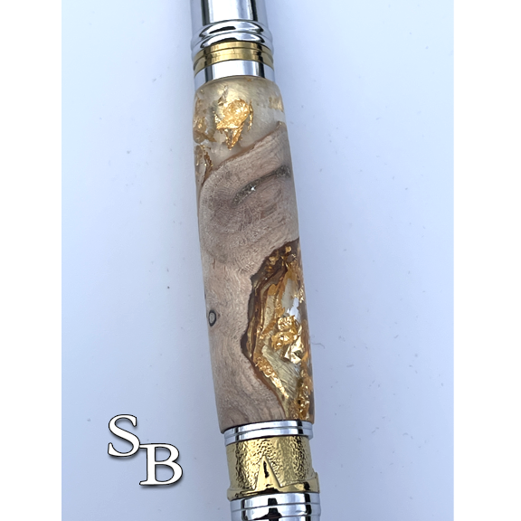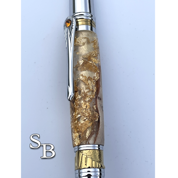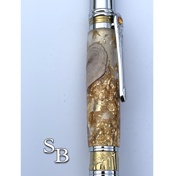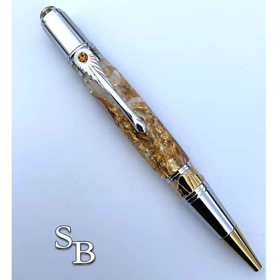 Made with Gold flake and repurposed grape vine for the body of the pen; Gold Titanium and chrome metal with a Swarovski Crystal.